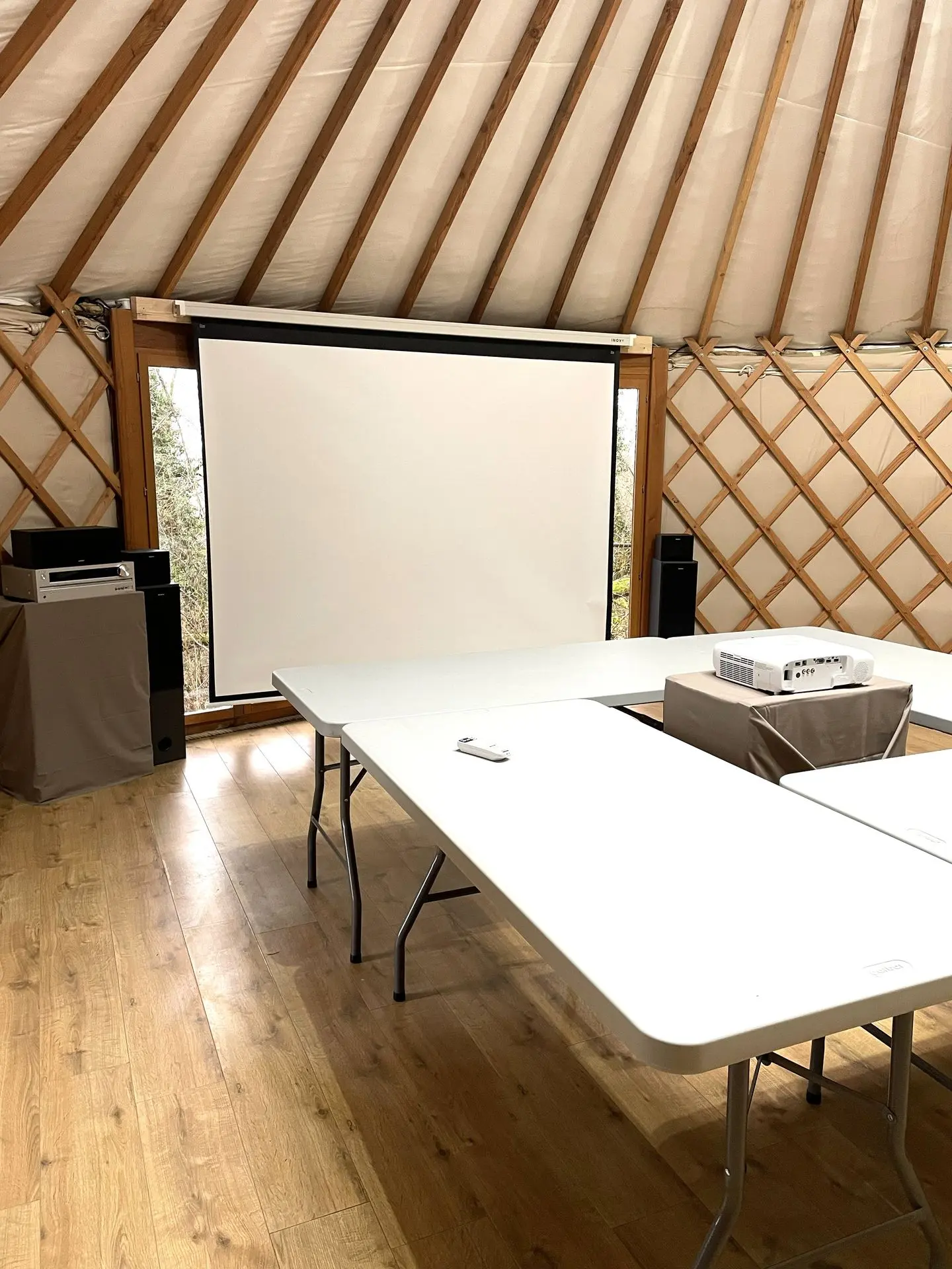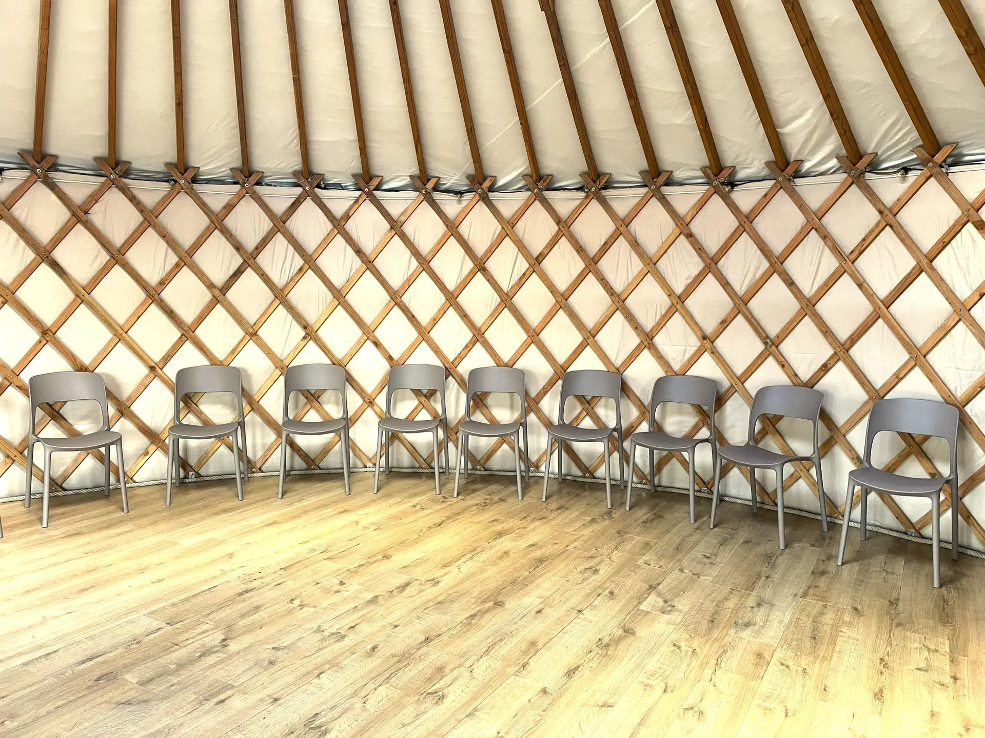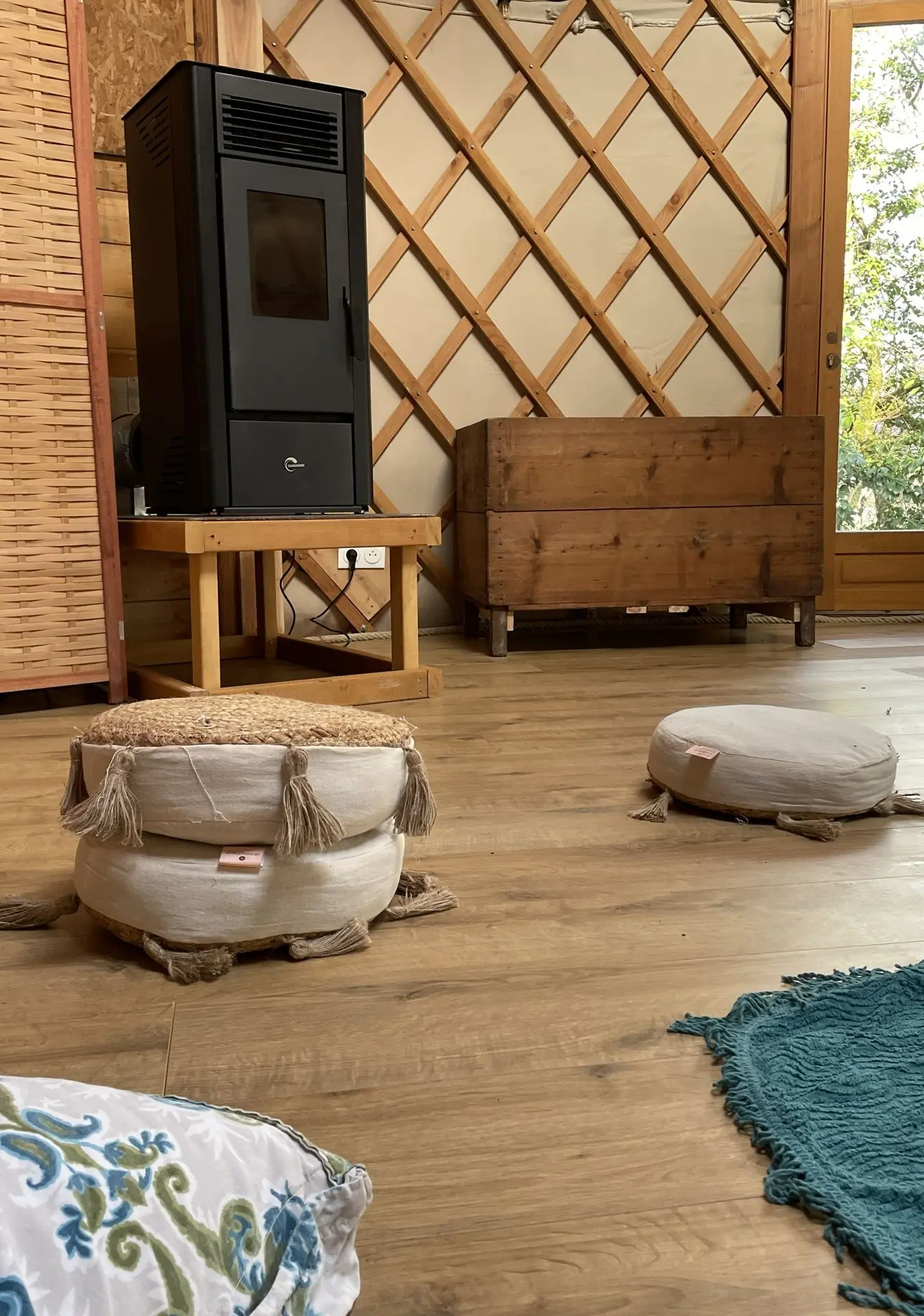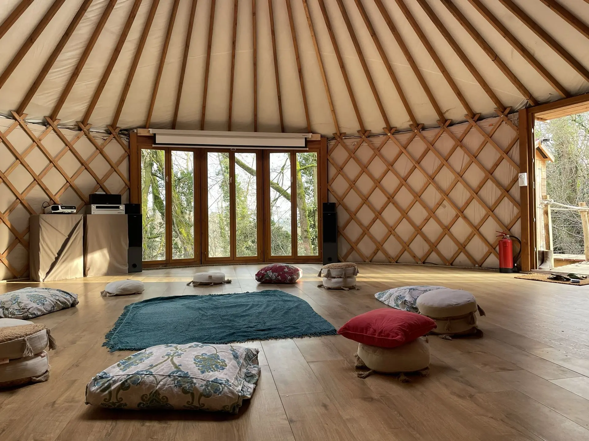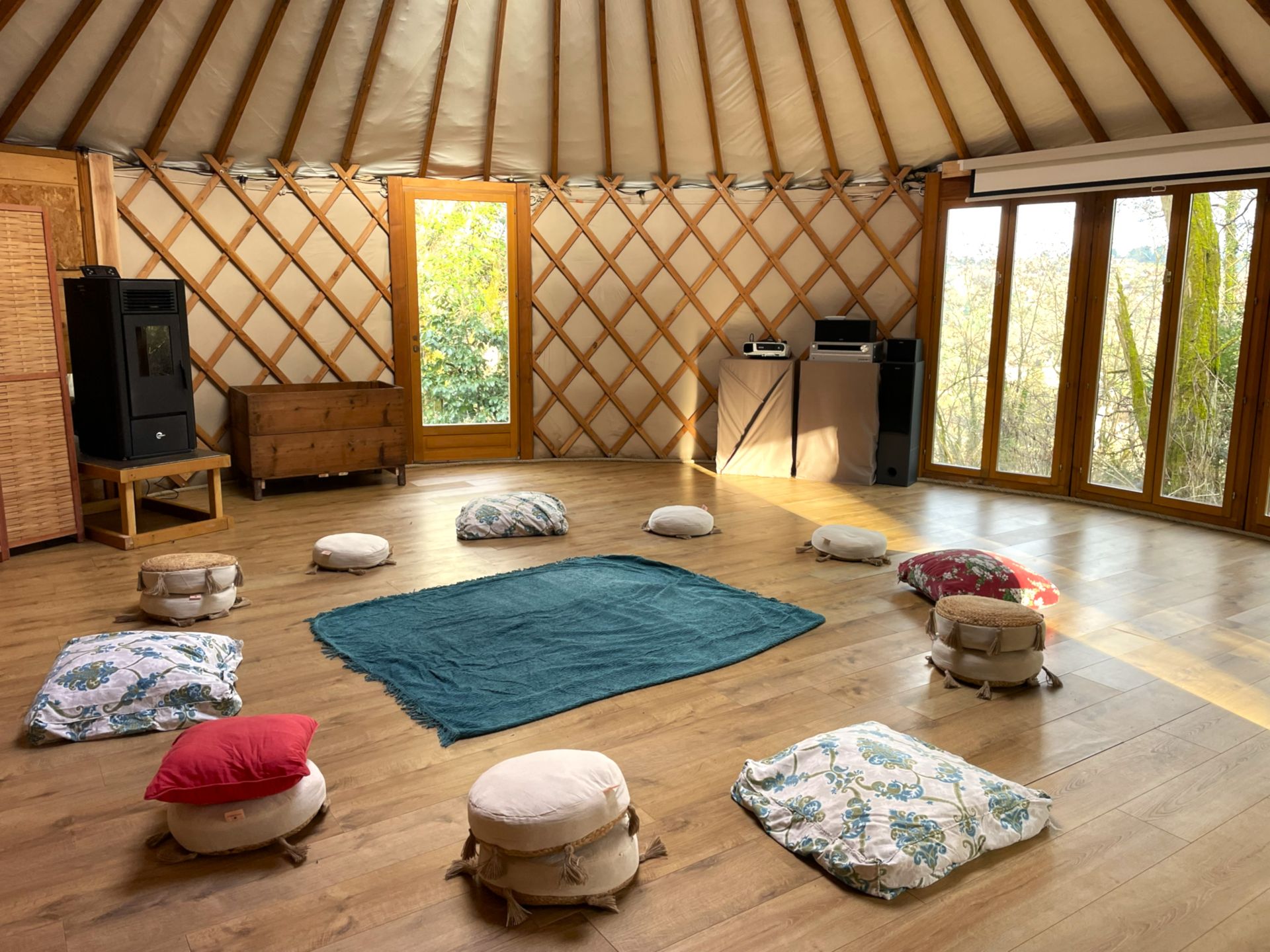 Elle offre un espace chaleureux et polyvalent. Lumineuse, chauffée (poêle à pellet), isolée avec matériaux naturels et ouverte sur la nature, elle peut être aménagée selon vos besoins : Disposition en cercle - Configuration tables et chaises - Espace libre pour pratique au sol