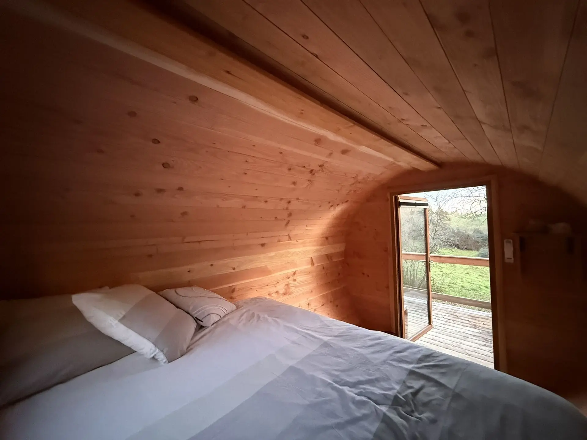 De l'autre côté, un peu plus loin sur le terrain, à 100 mètres, on retrouve les chalets et logements insolites sous les arbres.