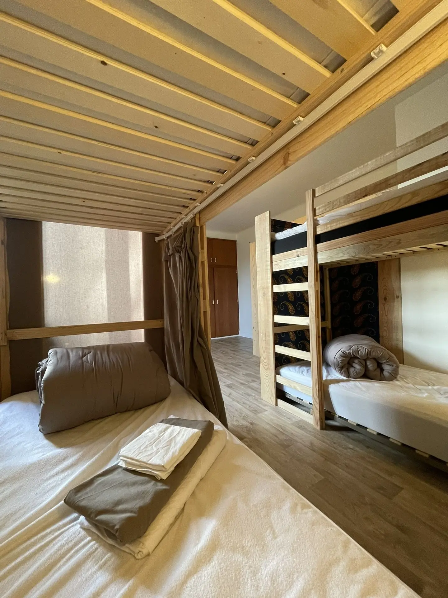Chambre avec 6 lits simples, ambiance dortoir chaleureux et intimiste, avec rideaux, armoires privatives, prises et lumières individuelles. Les 4 chambres individuelles peuvent être également aménagées en chambres partagées.